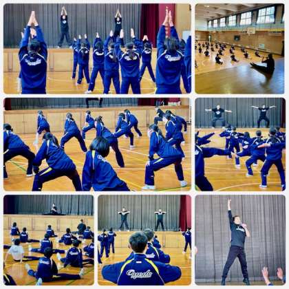 ウォームアップで身体をほぐしたあと、リズムの取り方を教えてくださりました。とてもいきいきと楽しそうでした。5時間目は学習した内容(ダンス)の発表会が予定されています。