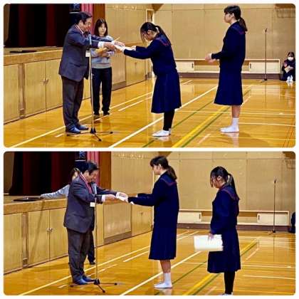 最初に表彰状の伝達です。家庭科副読本「考えよう! わたしたちの 快適な住まい」第29回読書後感想文コンクールに3年生 戸田さん、山下さんが入賞し表彰状をいただきました。全校生徒の前で紹介し披露しました。戸田さんは銀賞を受賞したので、2月20日発行の「教育新聞」にも受賞者が紹介されていました。