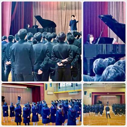 今日は、まだ椅子など無い状態ですが座席位置の確認、入退場の流れの確認、卒業生合唱の練習をしました。