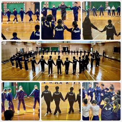 授業の最後に2クラスずつで、手をつなぎ1つの大きな輪を作り「マイムマイム」を踊って、ダンスの学習が終わりました。