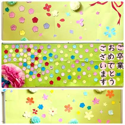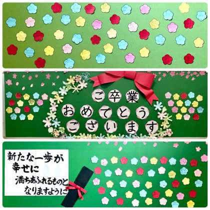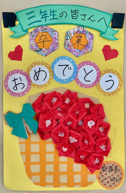 今朝、登校した3年生にはサプライズです。先週金曜日放課後、中央階段の掲示板に在校生からメッセージを飾ってくれました。いよいよ卒業式が近づいてきました。配膳室前にも配膳員さんがメッセージを飾ってくださいました。