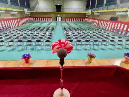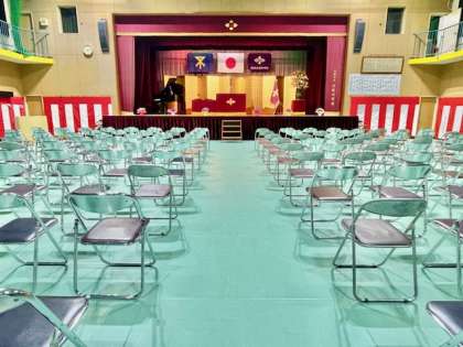 なお、保護者の皆様方の受け付けは午前9時15分よりとさせていただいております。玄関ホールで受付を済ませて会場にご入場ください。