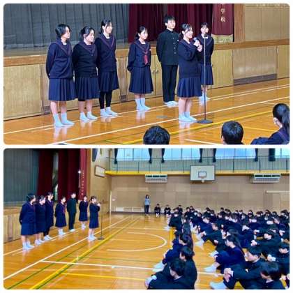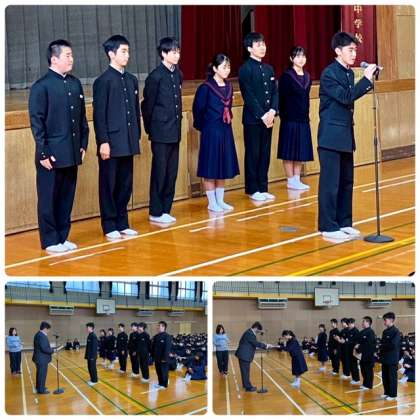 体育館で、校長先生から令和7年度前期生徒会役員に認証状が渡されました。その後、令和6年度生徒会役員の離任の挨拶がありました。