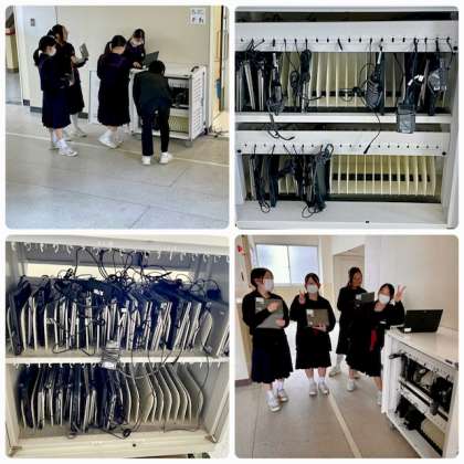 学習者用端末(ひとり1台パソコン)も、データを消去して一度各クラスのラックに返却しました。春休み中にアップデートして、新年度あらためて配付して使います。