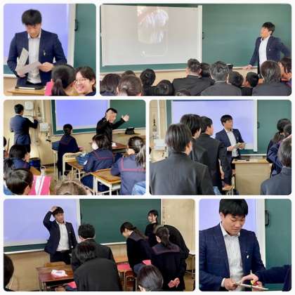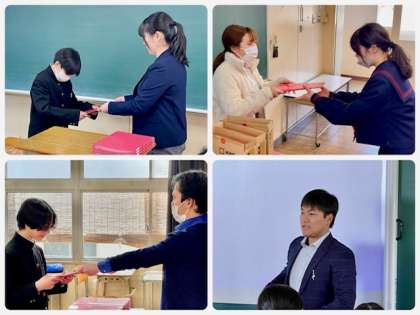 体育館での修了式を終えた生徒は、それぞれのホームルーム教室に戻り、担任の先生から修了証書と通知票をいただきました。学級活動では、担任からのお話やスライドショー、記念写真撮影、離任する先生へのサプライズなど思い思いに別れを惜しんでいました。