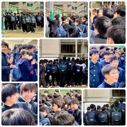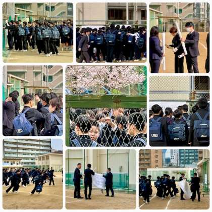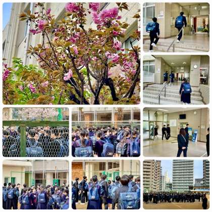 おはようございます。正門前の八重桜が見事に咲いています。始業式の前にグラウンドで2・3年生の学級編成を発表しました。
