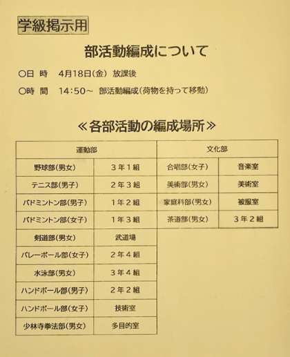 新入生の部活動体験も本日17時で終了です。明日は授業終了後に1〜3年生の部活動編成が予定されています。