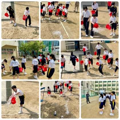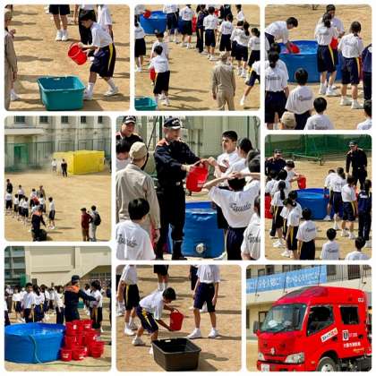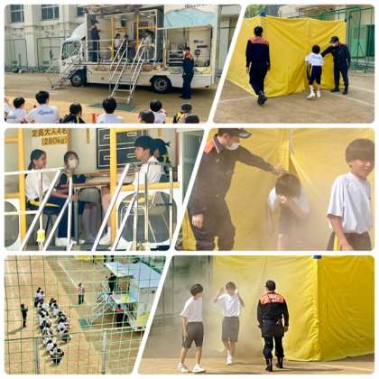2次避難のあとは、学年別防災カリキュラムです。1年生は、起震車体験、煙体験、防災クイズ、バケツリレーを体験しました。