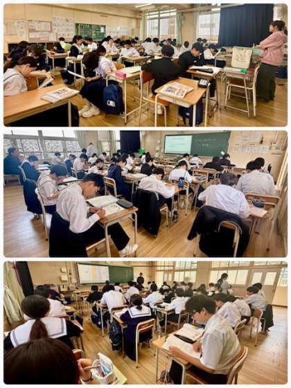 心地よい季節になりましたね。1年生の1時間目の1年生の授業の様子です。1組は英語、2組は社会、3組は国語です。どのクラスも落ち着いて学習に取り組んでいます。