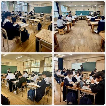 続いて2年生の授業の様子です。1組は技術・家庭です。クラスを半分に分けて少人数指導で学習しています。2組は数学です。松田先生と八田先生が教室内習熟授業です。一斉授業に終始するのでなく、個別指導で学習が進みます。3組は社会です。社会はグループワークで授業が進みます。1人1台の学習者用端末を使いながら、課題に取り組んでいました。