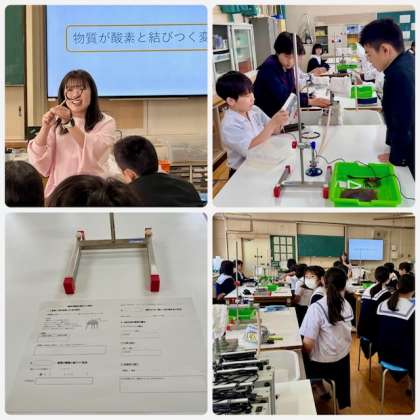 4組は理科室で「物質が酸素と結びつく変化」の実験をしていました。生徒は意欲的に学習していました。