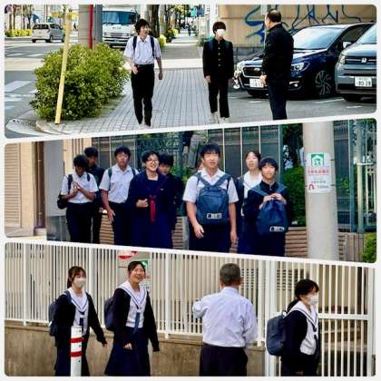 朝の登校風景です。交通量の多い交差点には教職員が立って、見守りをしています。