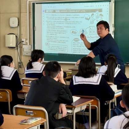 2年3組は理科です。原子記号のカードゲームで楽しく学習しています。