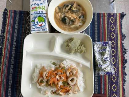 今日のかやくご飯には、鶏肉、ちくわ、にんじん、さんどまめが入っています。