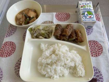 給食のちくわのいそべあげは、ちくわに小麦粉と青のりを混ぜた衣を付けて揚げています。
