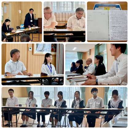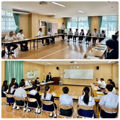 午後2時から多目的室で、令和7年度第1回学校保健委員会を開催しました。学校保健委員会は、校医の先生方、生徒代表(保健委員)、保護者ご代表、教職員の4者で構成します。学校保健委員会の前に3年生の保健委員の皆さんが、今年度の取り組みについて相談しました。昨年と同じですが、1.睡眠について、2.朝食について、3.給食(残食)について調査・研究を進めることにしました。