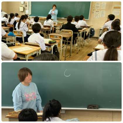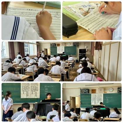 4時間目の授業の様子です。1組は音楽の学習です。独唱の実技テストをしていました。受験する生徒以外は課題をして実技テストを見守ります。ドキドキ緊張しながらも、クラスメイトの前で立派に歌いきっていました。1人1人の歌が終わるたびに、頑張りに対して拍手がおこります。安心した空間です。