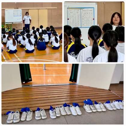 校舎内を参観していると、体育館の入り口に運動靴が綺麗に整頓されている様子から、体育館に入りました。3年3・4組女子がバレーボールの学習が終わろうとしていました。整然とした授業はとても気持ちいいです。