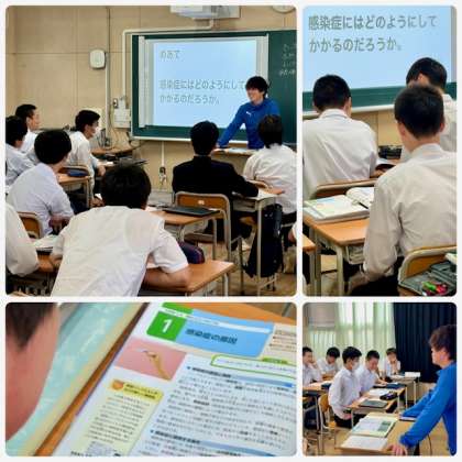 教室では、3年3・4組男子が保健の授業で、感染症について学習していました。とても和やかで、集中して学習していました。