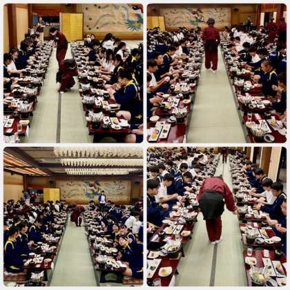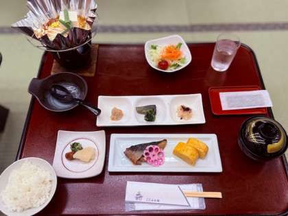 朝食のメニューは、先付(おからサラダ、ゆかり染めおろし、ホウレン草胡麻和え、那須オランダ煮)、焼き物(ブリの照り焼き、出汁巻き玉子)、湯豆腐、洋皿(キャベツとトマトのサラダ)、石川県産コシヒカリ、焼き海苔、田舎味噌、香物(大根いしる漬、梅干し、野沢菜)です。