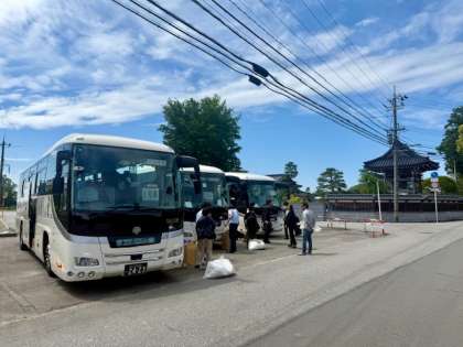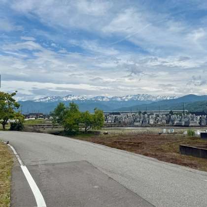 ラフティング会場の駐車場、萩生公民館前に到着しました。北アルプスが神々しく雪を湛えています。