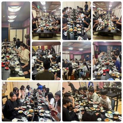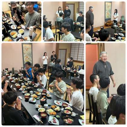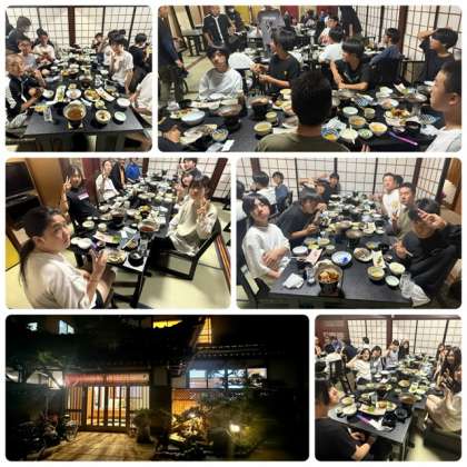 夕食の時間です。今日は伝統工芸体験とラフティングでとても充実しました。おかげでお腹もぺこぺこです。