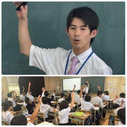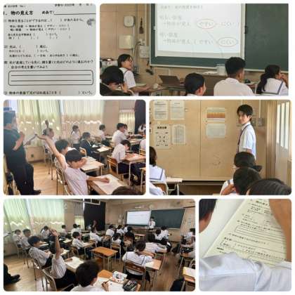 6時間目、1年1組は理科は、単元「光の世界」の学習です。今日は実習生の櫻井先生が教えてくださいました。生徒は自分の考えを、手を挙げて活発に発言し、たくさん意見が出る授業でした。