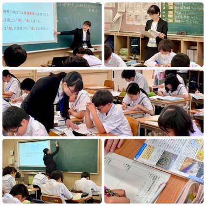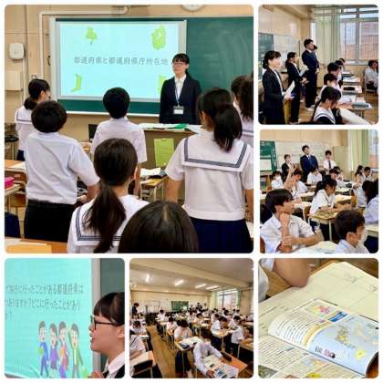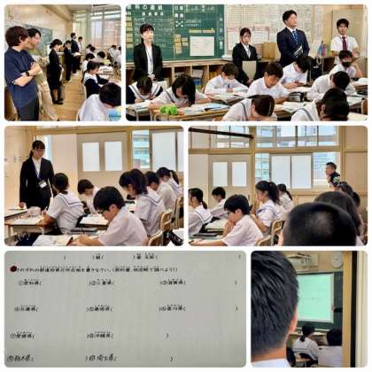 1時間目、1年1組で国語科実習生の坂巻先生の研究授業を行いました。単元「都道府県と都道府県所在地」の学習です。授業の導入で「今までに行ったことがある都道府県はいくつありますか?」の質問に、生徒は自身の体験をもとに活発に発表しました。一気に今日のめあてについて興味関心が高まりました。テンポ良い授業展開やICTを活用した授業に生徒は発言したり、ワークシートに記入したりしました。教科書をもとにリーディングスキルを高めたものでした。大阪大谷大学の今井澄子教授をはじめ、たくさんの先生や実習生が参観しました。