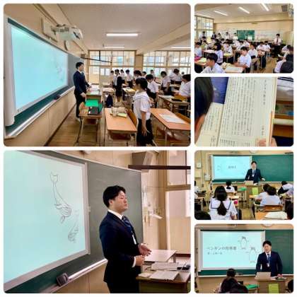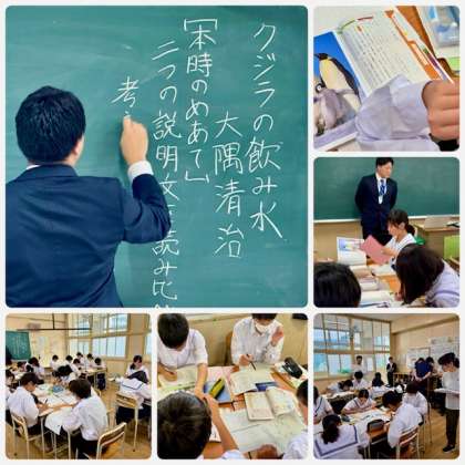 教材「クジラの飲み水」の学習をしました。先生の質問にとても積極的に生徒の返答が印象的でした。「クジラの飲み水」と「ペンギンの防寒着」2つの説明文を比較して考えます。グループで話し合って考えを深める授業でした。