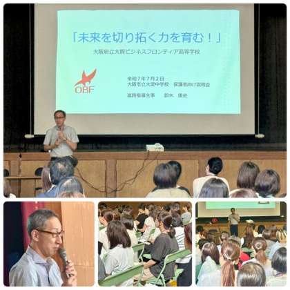 校長先生のお話に続き、進路指導主事の沖先生からの概論に続き、大阪府立大阪ビジネスフロンティア高等学校進路指導主事の鈴木先生、大阪府立高津高等学校校長の寺本先生からもお話を伺いました。とてもわかりやすいお話に引き込まれ、あっという間に終了予定時刻となりました。