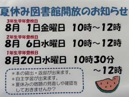 図書館の掲示板に、大淀中学校元気アップの「夏休み図書館開放のお知らせ」がありました。