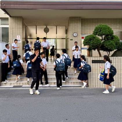 毎日、暑い日が続いていますが、生徒の皆さんは、頑張って登校しています。1学期最初の全校集会では、校長先生から今年度のめあて「しっかり挨拶をしましょう!」と話されました。