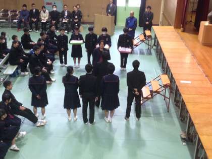 式練習終了後、2年生から3年生へのコサージュ贈呈式を行いました。地域ボランティアの皆さまや保護者の皆さまのご指導で2年生が作成したコサージュです。3年生はこのコサージュをつけて3月11日(金)に卒業式に臨みます。