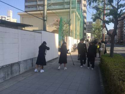 4月12日(火)、本校伝統の早朝清掃です。毎週火曜日と金曜日、8時から15分間、校内外の清掃を行っています。写真は、裏門を出た道路(なにわ筋)の掃き掃除と、金ばさみでたばこや空き缶などを拾っているところです。