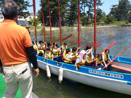 快晴のもと、カッター漕艇と自然観察の活動中です。