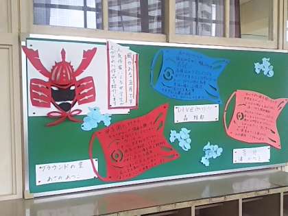 生徒の皆さんが気持ちよく図書館を利用でき、本が好きになるように図書館の整備や本のレイアウトなどをしていただいています。図書館前の掲示板には5月の飾り付けがされています。