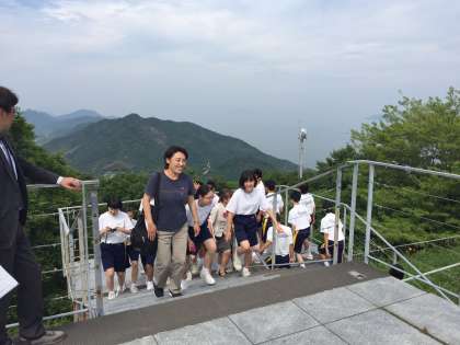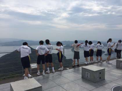 亀老山展望台に到着して、素晴らしい景色を眺めています。