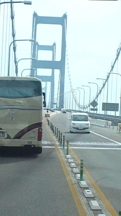 先ほどサイクリングし、観潮船から見上げた来島大橋をバスで渡っています。一路、愛媛へ。