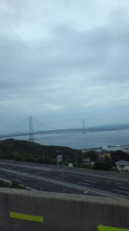 帰路で最後のトイレ休憩を終え、世界最長の吊橋である明石海峡大橋を渡りました。これまでの道中と風景がまったく違います。神戸です。