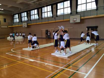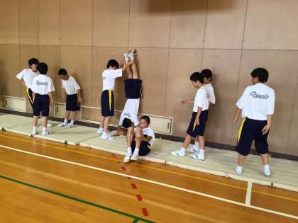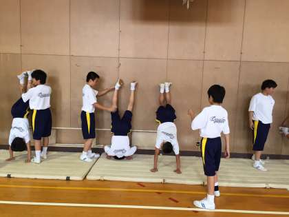 1年2組は犬飼教諭、平井教諭の体育です。倒立前転の練習をしています。