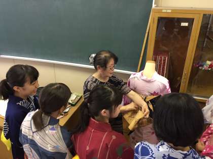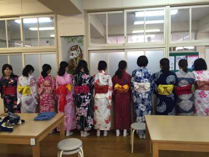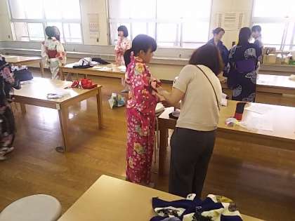 ゆかたの着付けと簡単な帯結びを教えていただきました。保護者の方々にも手伝っていただき、本校教諭の藤川も自前のゆかたで楽しみました。