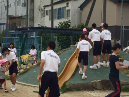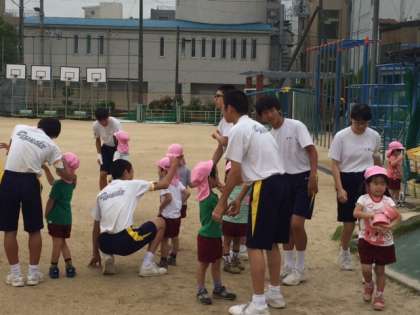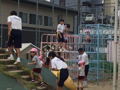 今日はグランドコンディションも良く、園庭で園児と遊んでいます。