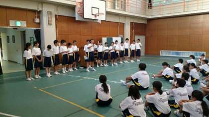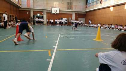 夕食が終わったら室内リクレーションです。生徒の運営で各競技が始まりました。写真は開会式と雑巾リレーです。