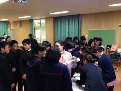 2年生は、大阪府済生会中津病院の産婦人科病棟から助産師さんに来ていただき、「生命の誕生」についての授業でした。ご講義のほかに、病棟スタッフの方々が作成されたビデオ教材を視聴したり、休憩時間には新生児の人形を抱く体験をしたり、胎児の模型などを見たりと、実り多い授業となりました。