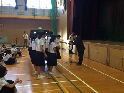 8月25日(木)始業式が行われ2学期がスタートしました。写真は表彰状の伝達をしているところです。表彰された部活はハンドボール部、合唱部、水泳部、剣道部、テニス部です。特に女子ハンドボール部は大阪府3位で、近畿大会まであと1勝、得失点差での敗退でした。