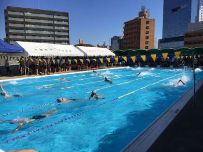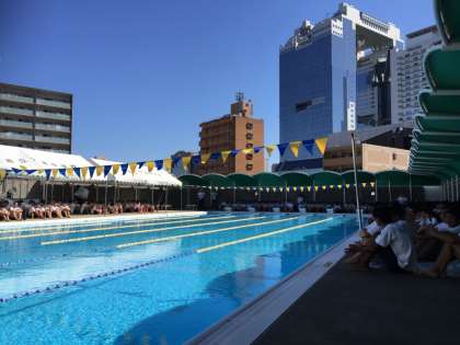 本校では体育館屋上のプールでスカイビルが見下ろす中、常設のテントに加え、大型の折りたたみテントを運びこみ、全校生徒が日陰に入れるよう工夫し、水泳大会を行っています。