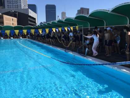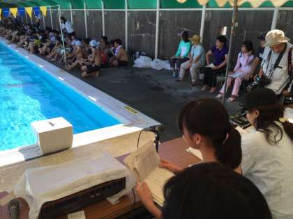 放送委員が選手の紹介をしています。水泳部が碁石拾いに向けてコースロープをはずしています。