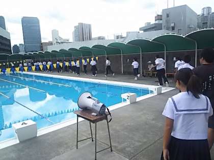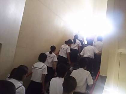今回は屋上のブールサイドに避難しましたが、津波の避難の際は全校生徒が本館4Fに避難します。