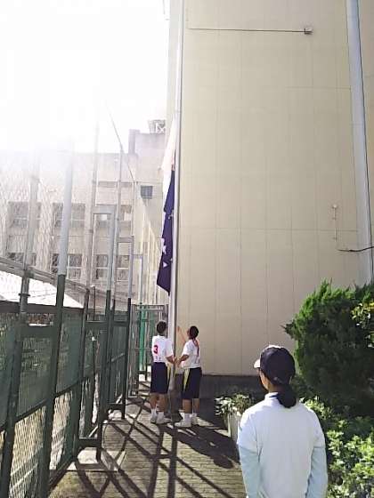 国旗、市旗、校旗掲揚のあと、体育委員長による生徒宣誓を行いました。