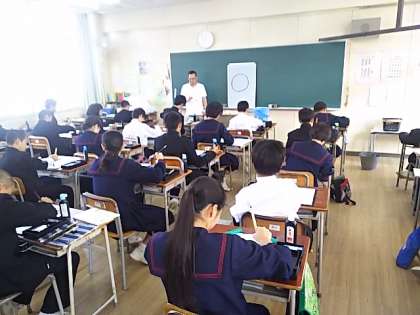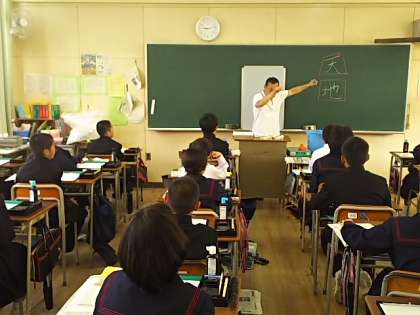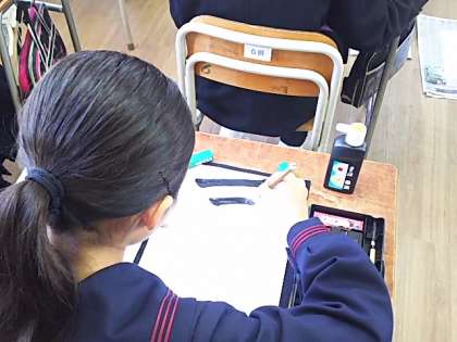 はじめに筆の使い方の練習(穂先を使って、丁寧に円や点を書きます。)を行い、次に「天地」という漢字を書きました。